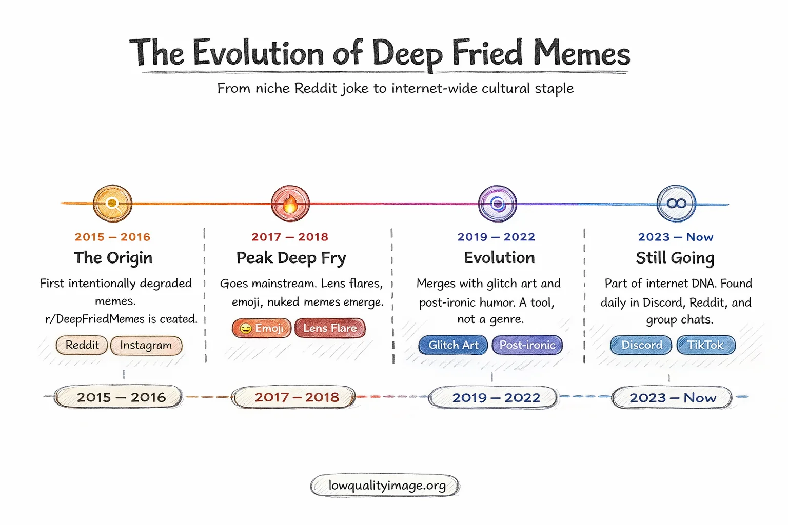The style originated around 2015-2016 on platforms like Reddit (r/DeepFriedMemes), Instagram, and Twitter. It started as a reaction to the increasingly polished, corporate feel of mainstream memes. Deep frying became a way to signal that a meme was organic, community-driven, and not trying too hard.