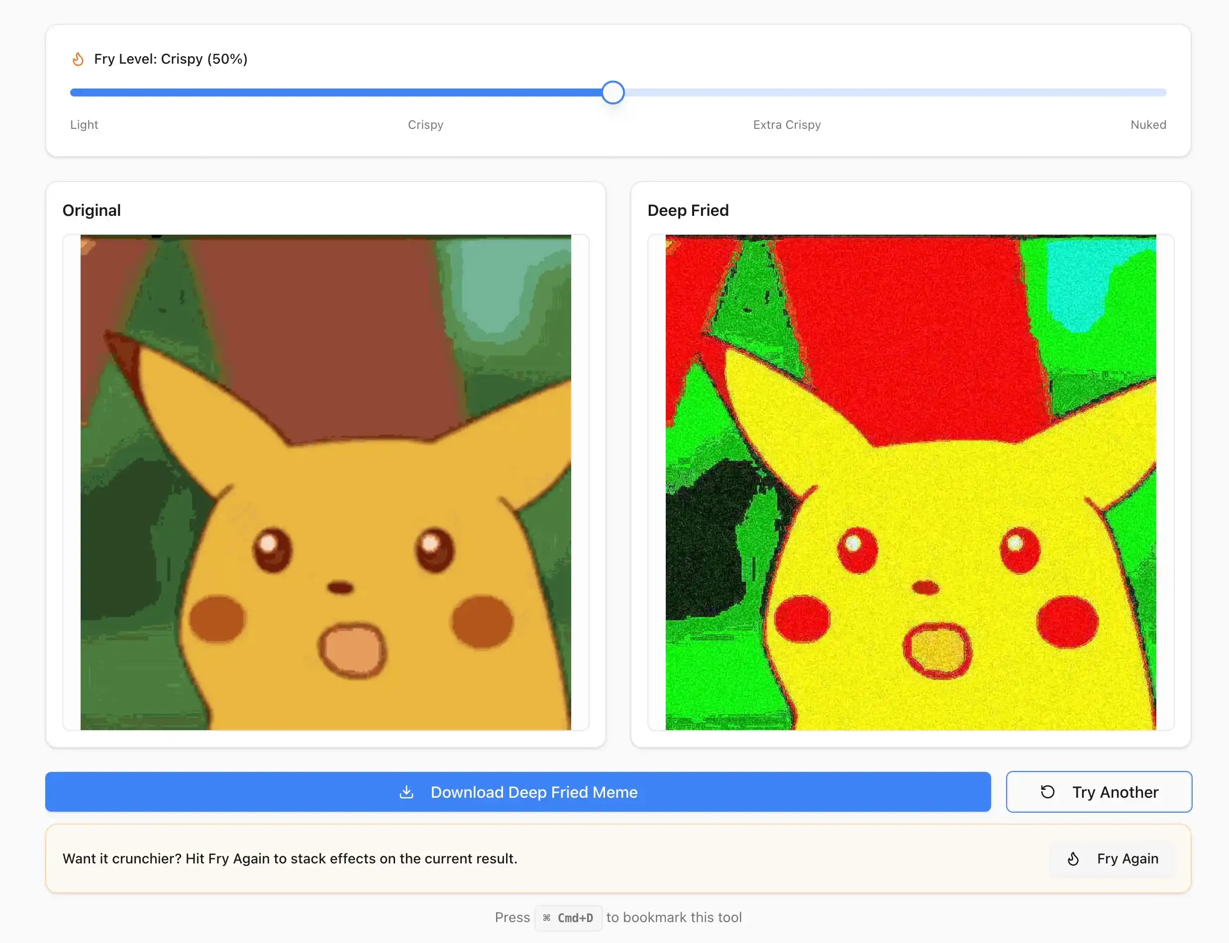 Hit Fry Again to apply the effect on top of itself. This is how you go from "deep fried" to "nuked." Each press compounds the degradation. Two or three rounds at medium fry level produces a satisfying crunch. Five or more rounds at max level enters blackhole territory.