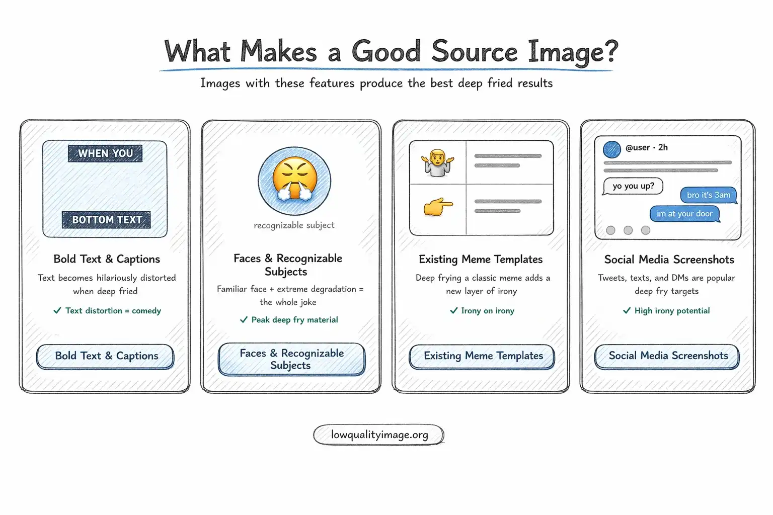 - Bold text or captions — Text becomes hilariously distorted when deep fried