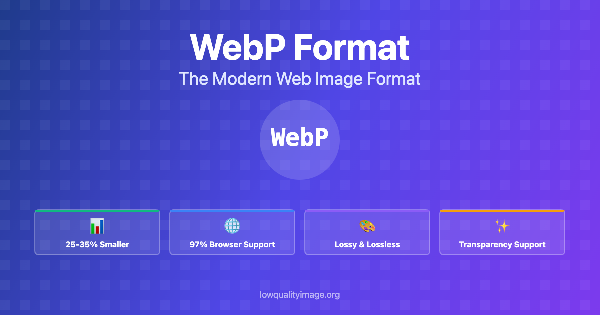 Deep dive into WebP: 25-35% smaller files, 97% browser support, lossy & lossless modes. Learn when to use WebP vs JPEG/PNG with real examples.